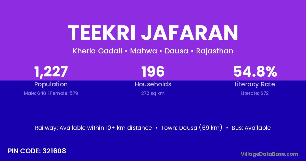 Dausa (69 km) is the nearest town to Teekri Jafaran village for major economic activities and is located approximately 69 km away.