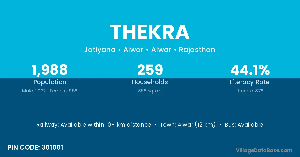 Dausa (61 km) is the nearest town to Thekra village for major economic activities and is located approximately 61 km away.