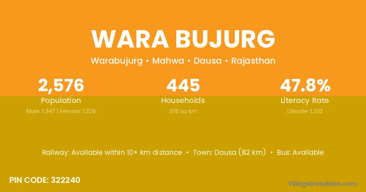 Dausa (82 km) is the nearest town to Wara Bujurg village for major economic activities and is located approximately 82 km away.