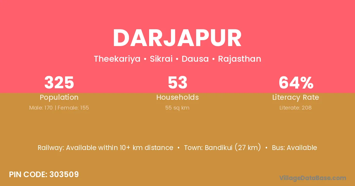 Bandikui (27 km) is the nearest town to Darjapur village for major economic activities and is located approximately 27 km away.