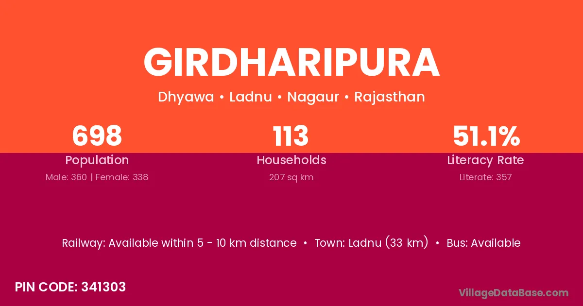 Bandikui (33 km) is the nearest town to Girdharipura village for major economic activities and is located approximately 33 km away.