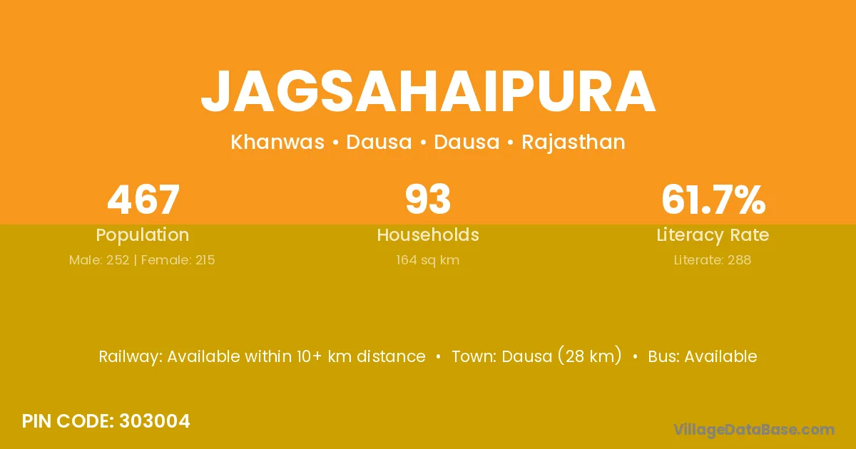 Bandikui (30 km) is the nearest town to Jagsahaipura village for major economic activities and is located approximately 30 km away.