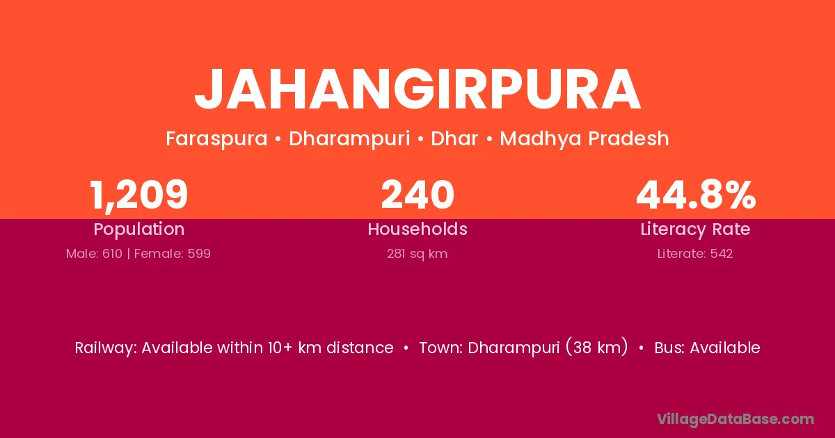 Jahangirpura village has a total population of 211 people, of which 105 are males and 106 are females.
