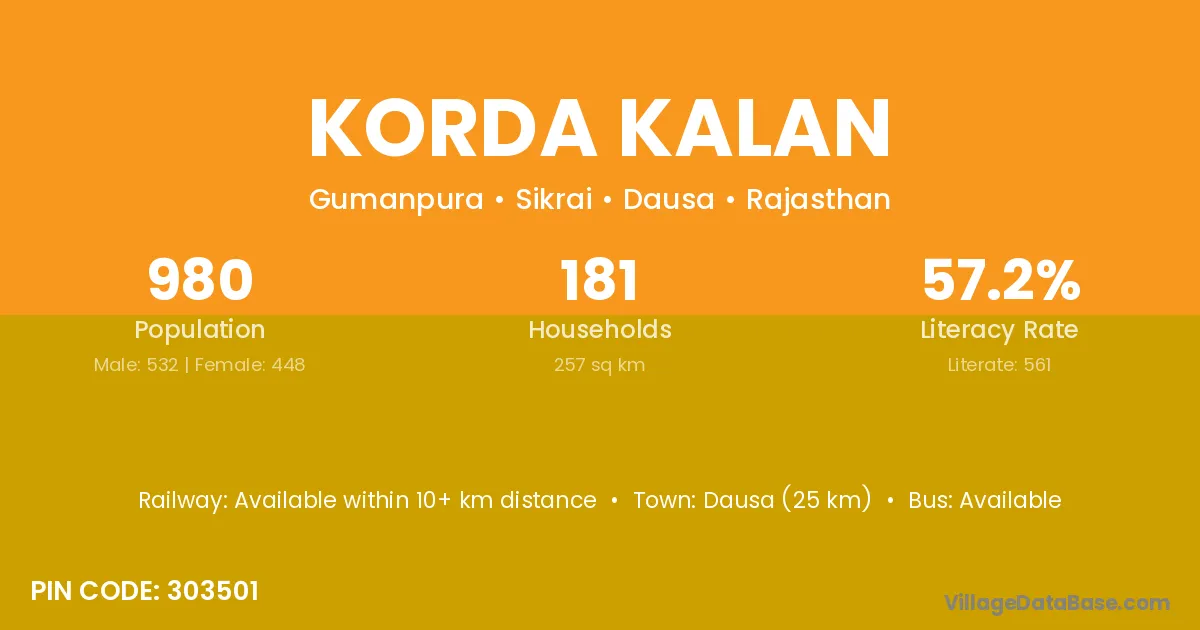 Korda Kalan village has a total population of 980 people, of which 532 are males and 448 are females.