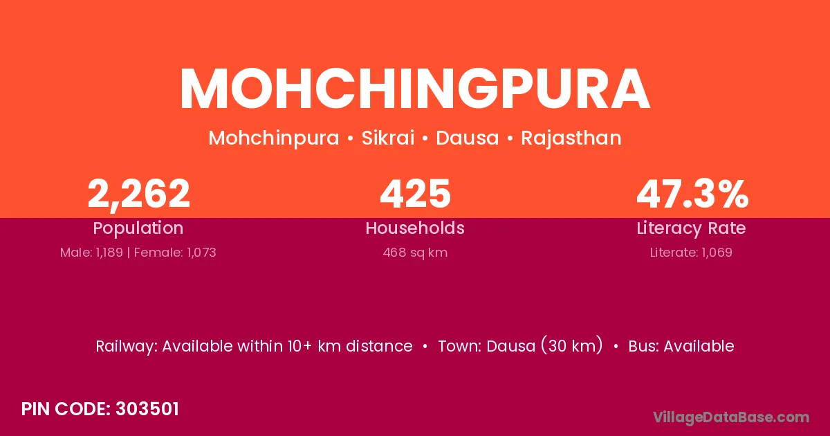 Dausa (30 km) is the nearest town to Mohchingpura village for major economic activities and is located approximately 30 km away.