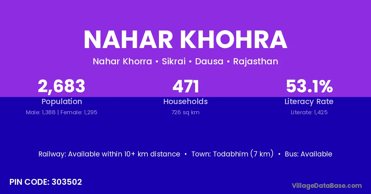 Todabhim (7 km) is the nearest town to Nahar Khohra village for major economic activities and is located approximately 7 km away.