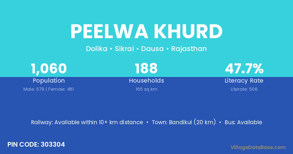 Bandikui (20 km) is the nearest town to Peelwa Khurd village for major economic activities and is located approximately 20 km away.
