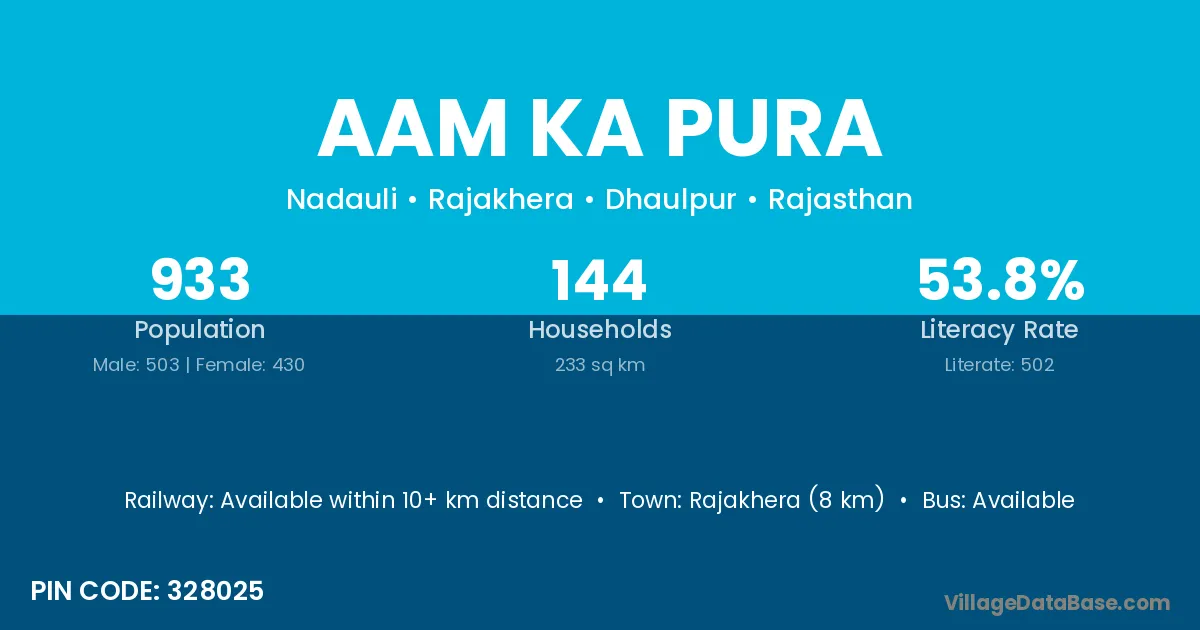 Dhaulpur (22 km) is the nearest town to Aam Ka Pura village for major economic activities and is located approximately 22 km away.