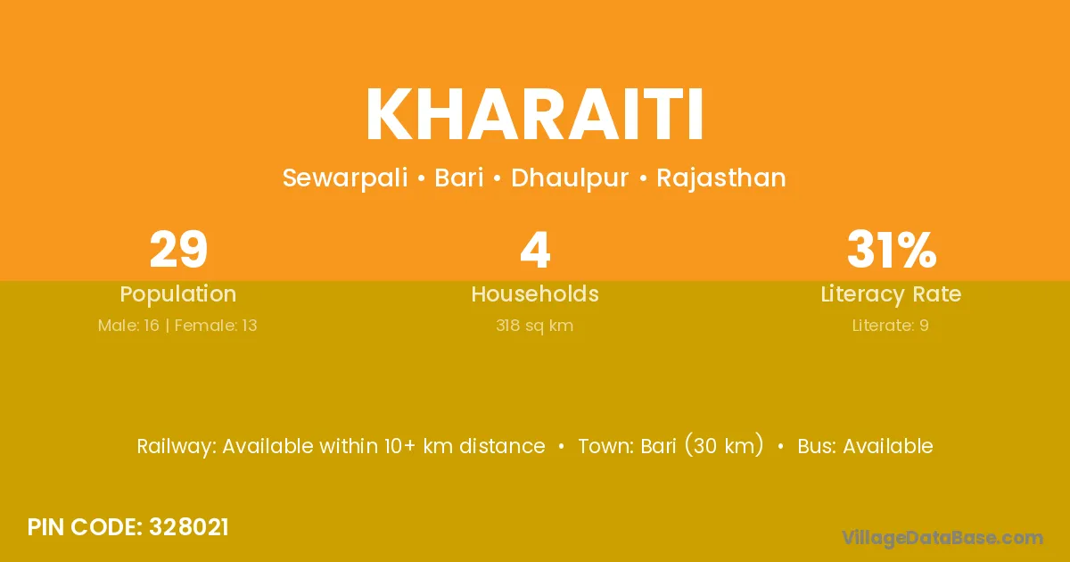 Bari (30 km) is the nearest town to Kharaiti village for major economic activities and is located approximately 30 km away.