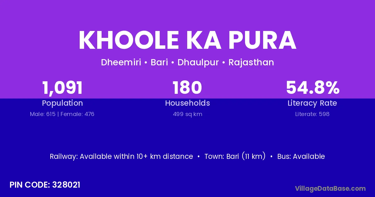 Bari (11 km) is the nearest town to Khoole Ka Pura village for major economic activities and is located approximately 11 km away.