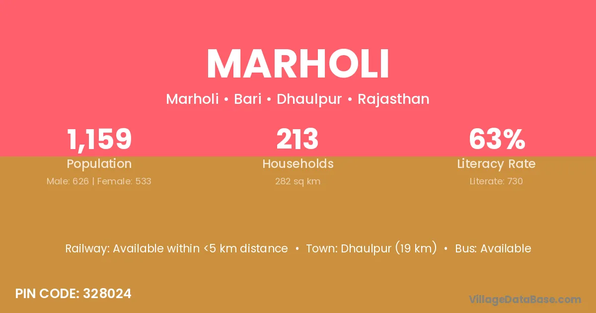 Dhaulpur (19 km) is the nearest town to Marholi village for major economic activities and is located approximately 19 km away.