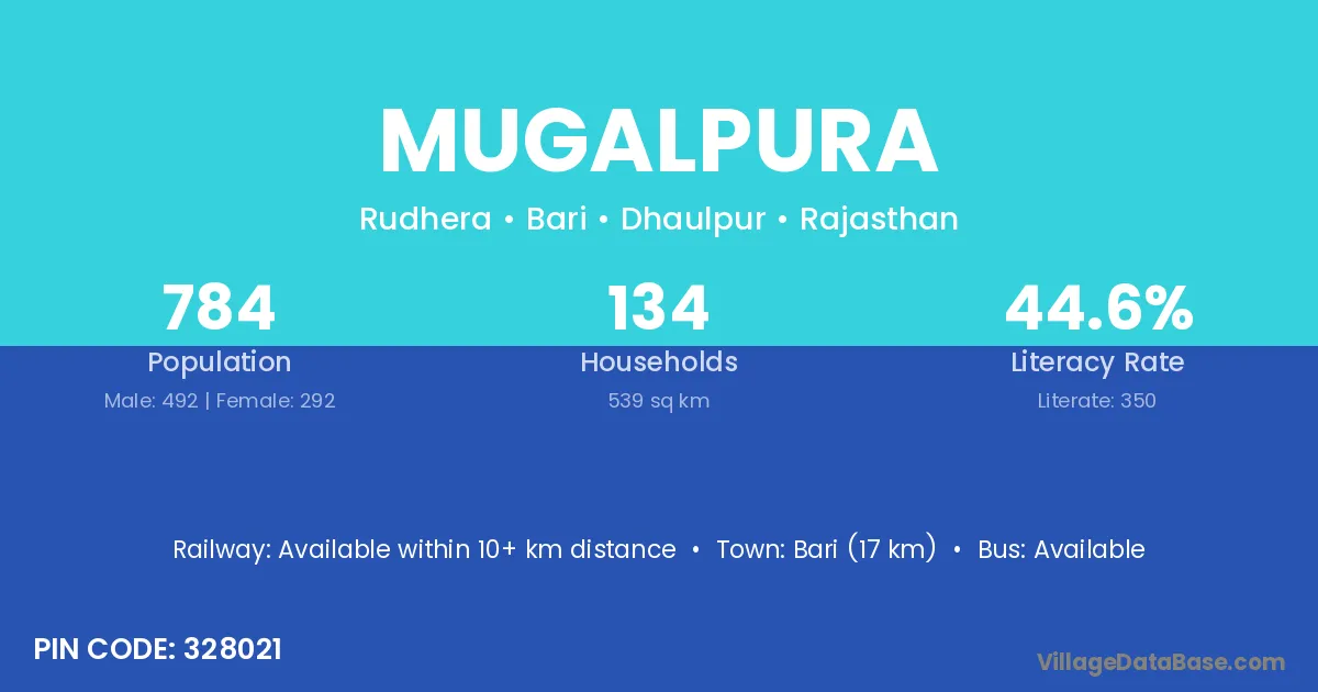 Bari (17 km) is the nearest town to Mugalpura village for major economic activities and is located approximately 17 km away.