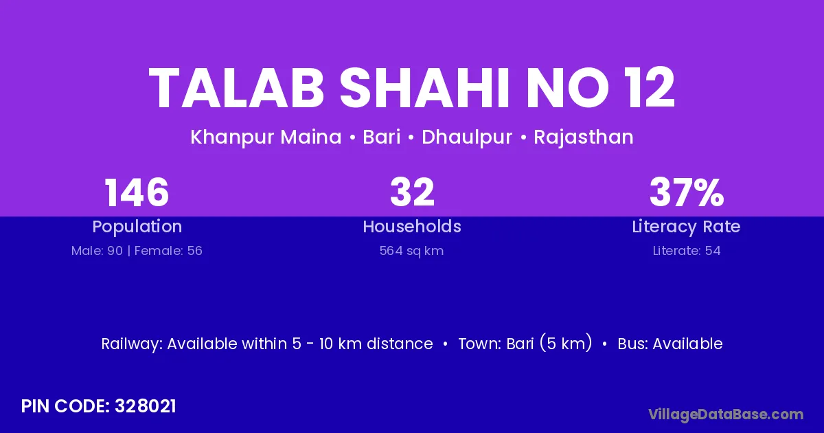 Bari (5 km) is the nearest town to Talab Shahi No 12 village for major economic activities and is located approximately 5 km away.