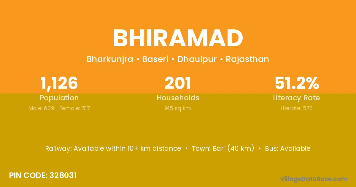 Bari (40 km) is the nearest town to Bhiramad village for major economic activities and is located approximately 40 km away.