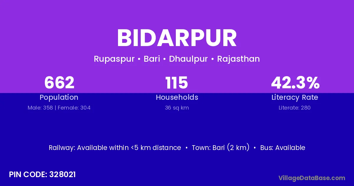 Bari (14 km) is the nearest town to Bidarpur village for major economic activities and is located approximately 14 km away.
