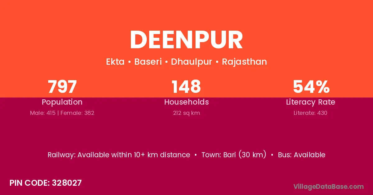 Bari (30 km) is the nearest town to Deenpur village for major economic activities and is located approximately 30 km away.