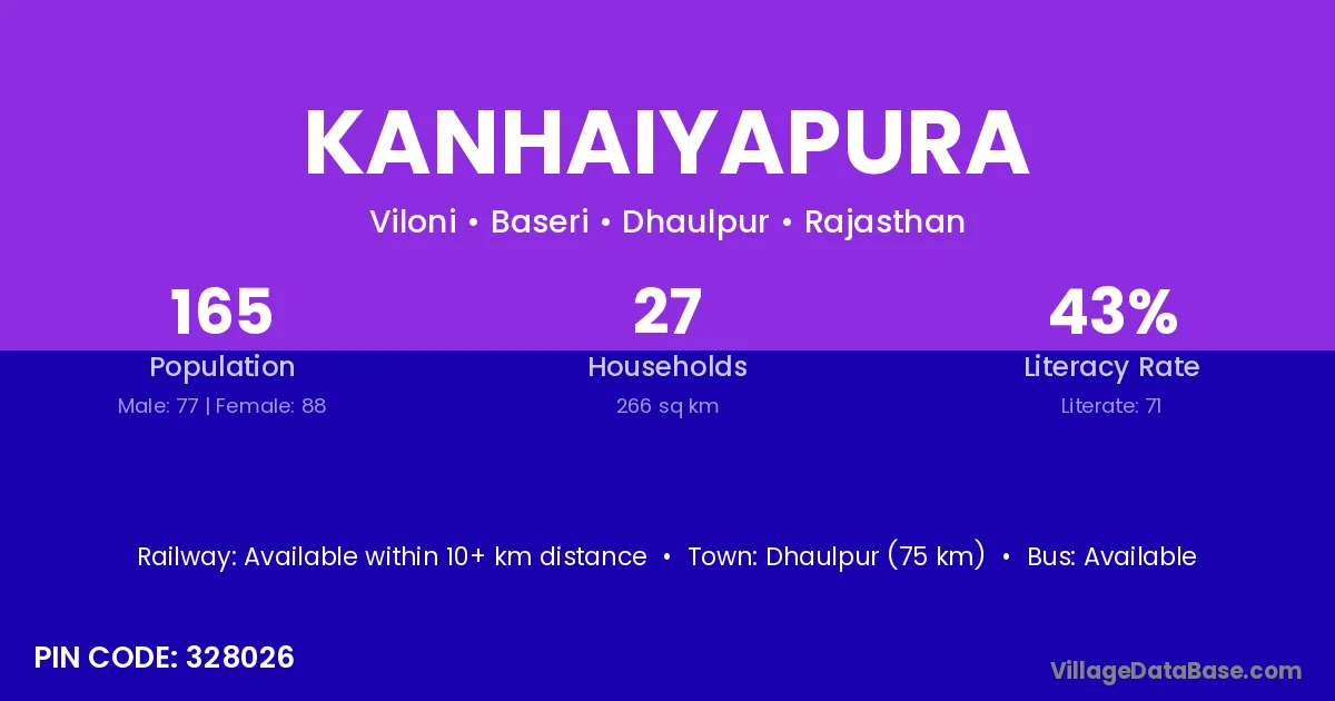Dhaulpur (75 km) is the nearest town to Kanhaiyapura village for major economic activities and is located approximately 75 km away.