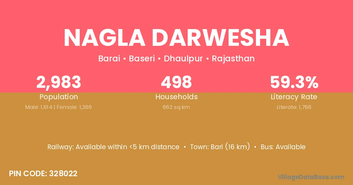 Bari (16 km) is the nearest town to Nagla Darwesha village for major economic activities and is located approximately 16 km away.