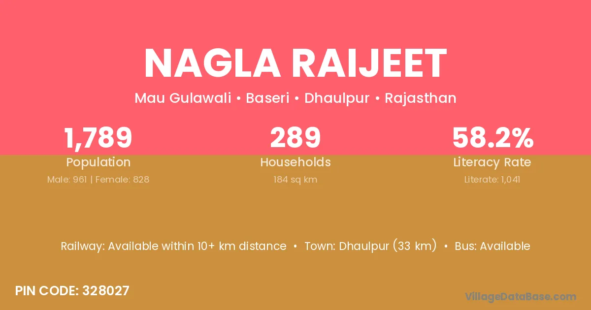 Dhaulpur (33 km) is the nearest town to Nagla Raijeet village for major economic activities and is located approximately 33 km away.