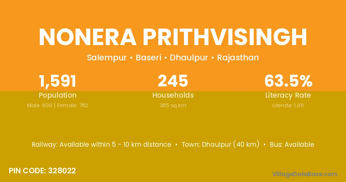 Dhaulpur (40 km) is the nearest town to Nonera Prithvisingh village for major economic activities and is located approximately 40 km away.