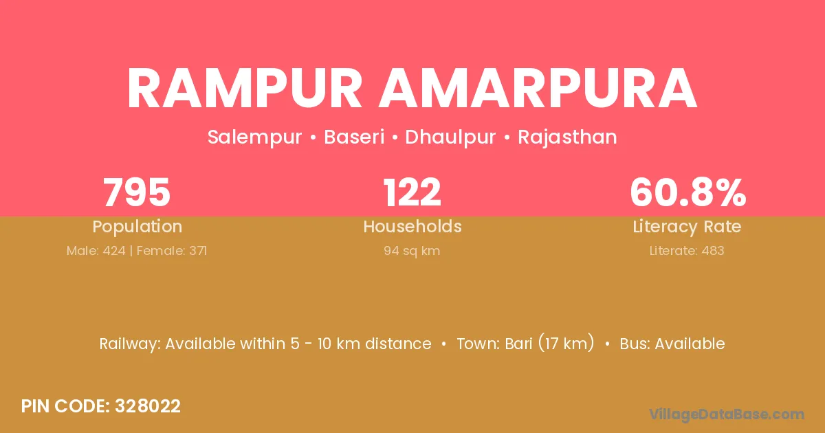 Bari (17 km) is the nearest town to Rampur Amarpura village for major economic activities and is located approximately 17 km away.