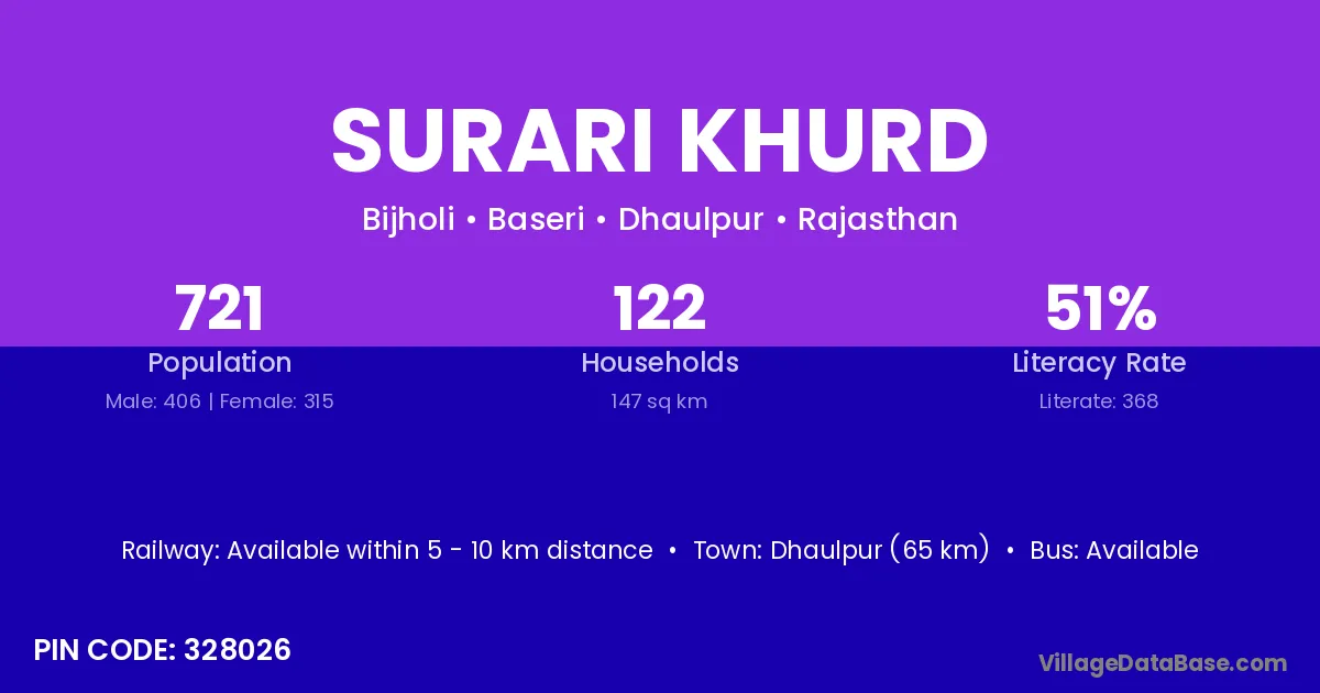 Dhaulpur (65 km) is the nearest town to Surari Khurd village for major economic activities and is located approximately 65 km away.