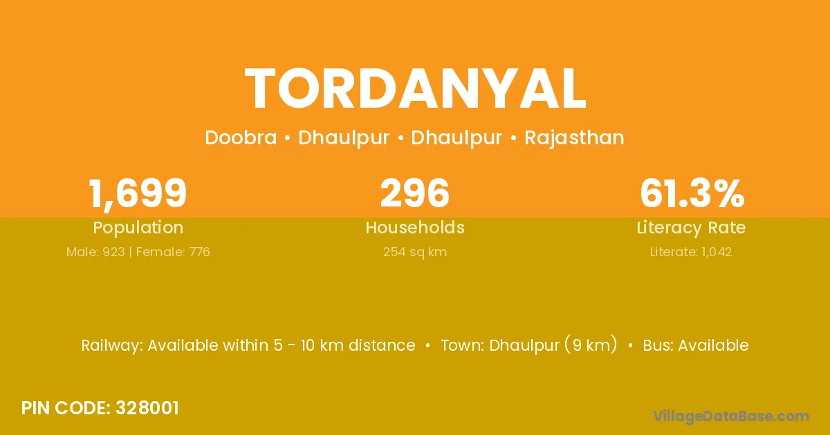 Dhaulpur (9 km) is the nearest town to Tordanyal village for major economic activities and is located approximately 9 km away.
