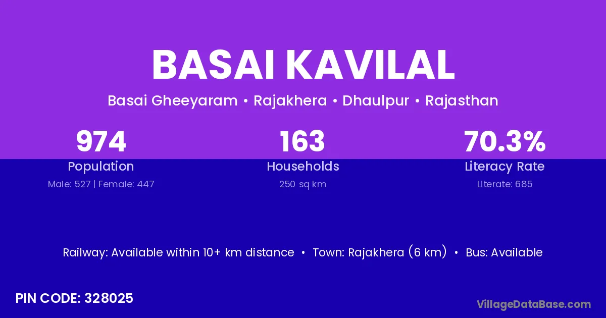 Rajakhera (6 km) is the nearest town to Basai Kavilal village for major economic activities and is located approximately 6 km away.