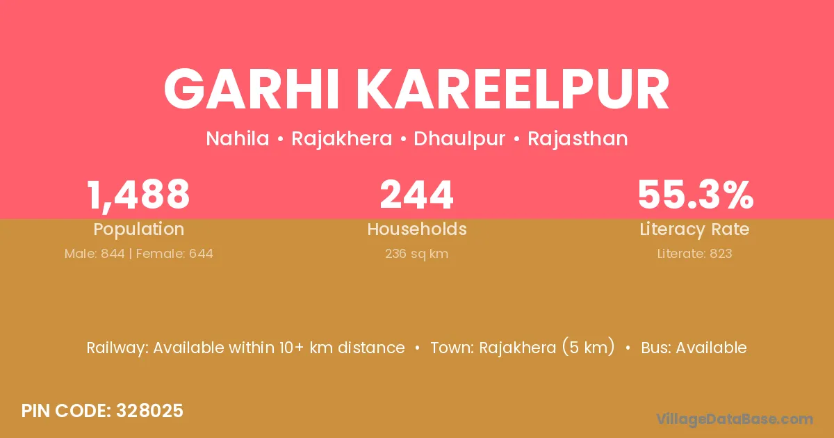 Rajakhera (5 km) is the nearest town to Garhi Kareelpur village for major economic activities and is located approximately 5 km away.