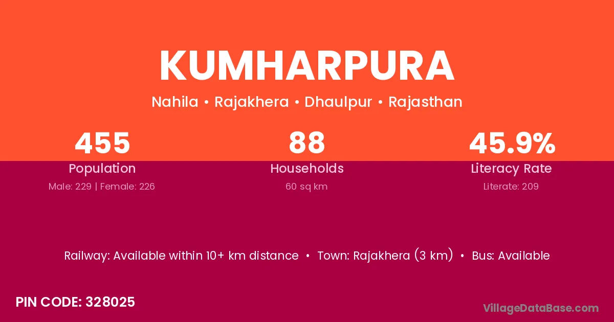 Kumharpura village has a total population of 455 people, of which 229 are males and 226 are females.
