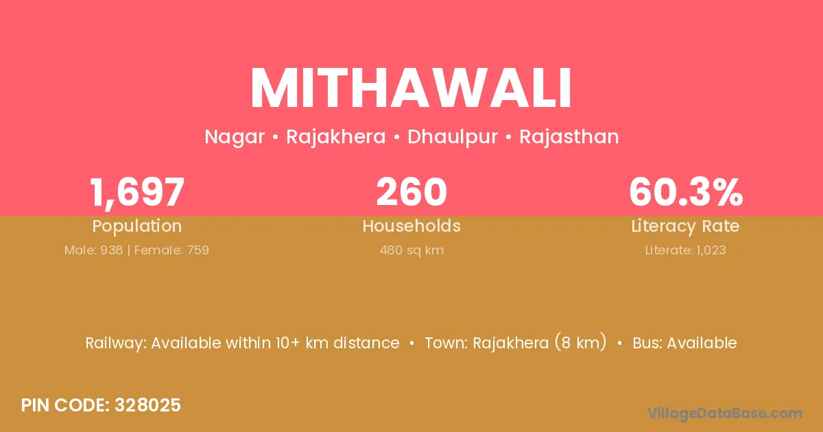 Rajakhera (8 km) is the nearest town to Mithawali village for major economic activities and is located approximately 8 km away.