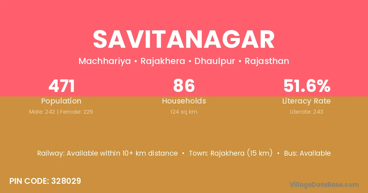 Rajakhera (15 km) is the nearest town to Savitanagar village for major economic activities and is located approximately 15 km away.