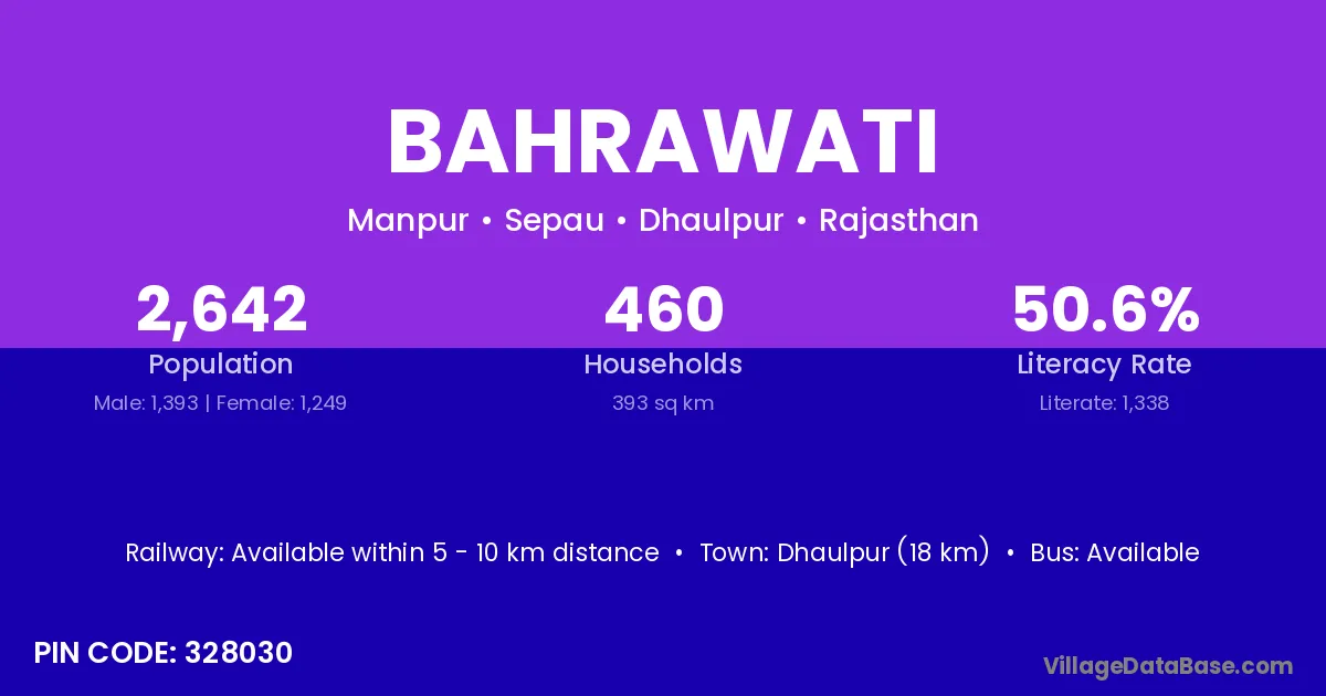 Dhaulpur (18 km) is the nearest town to Bahrawati village for major economic activities and is located approximately 18 km away.