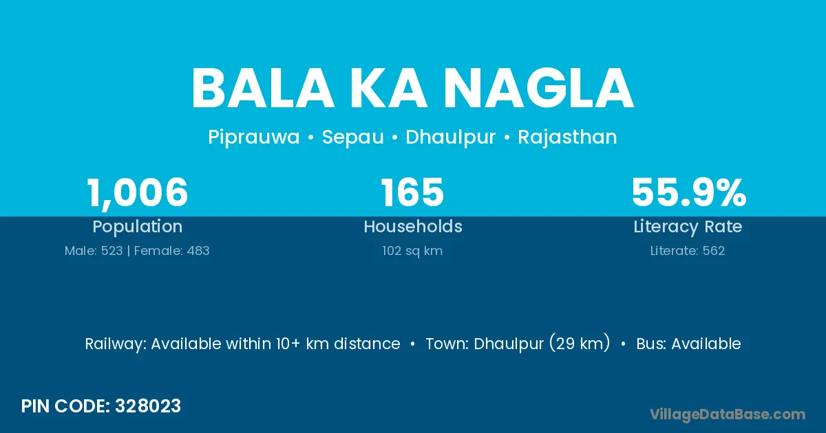 Dhaulpur (29 km) is the nearest town to Bala Ka Nagla village for major economic activities and is located approximately 29 km away.