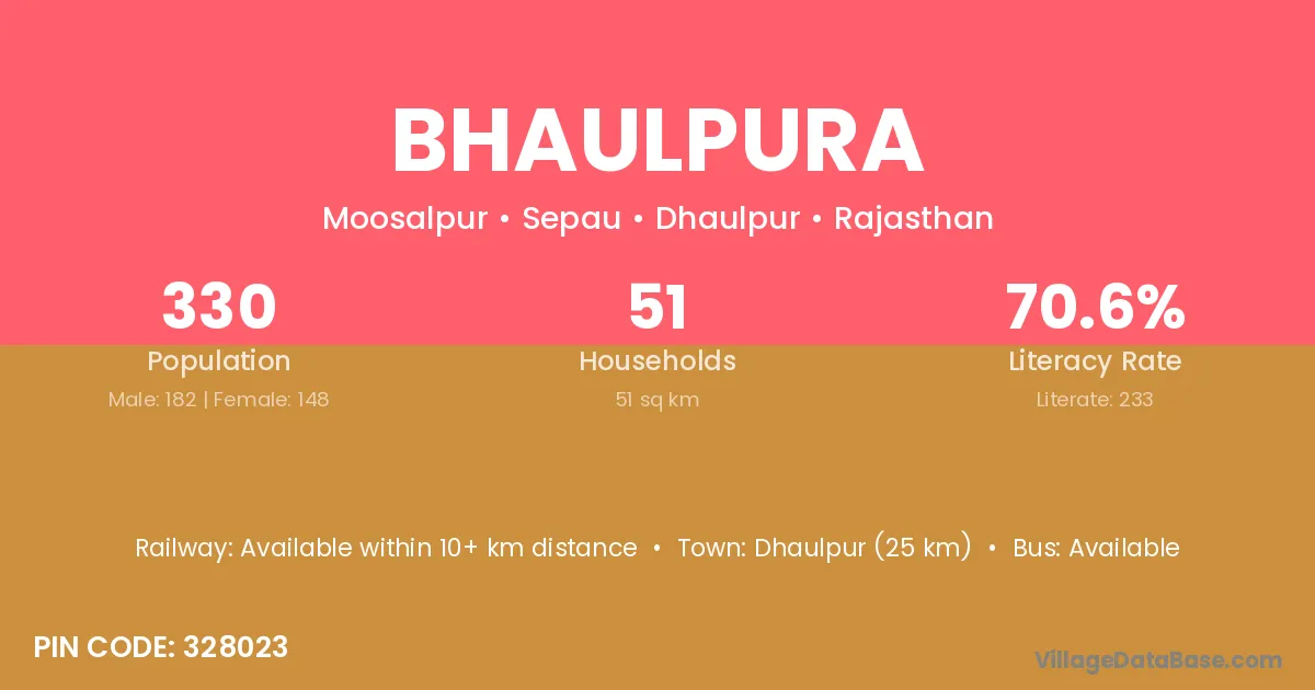 Bhaulpura village has a total population of 330 people, of which 182 are males and 148 are females.
