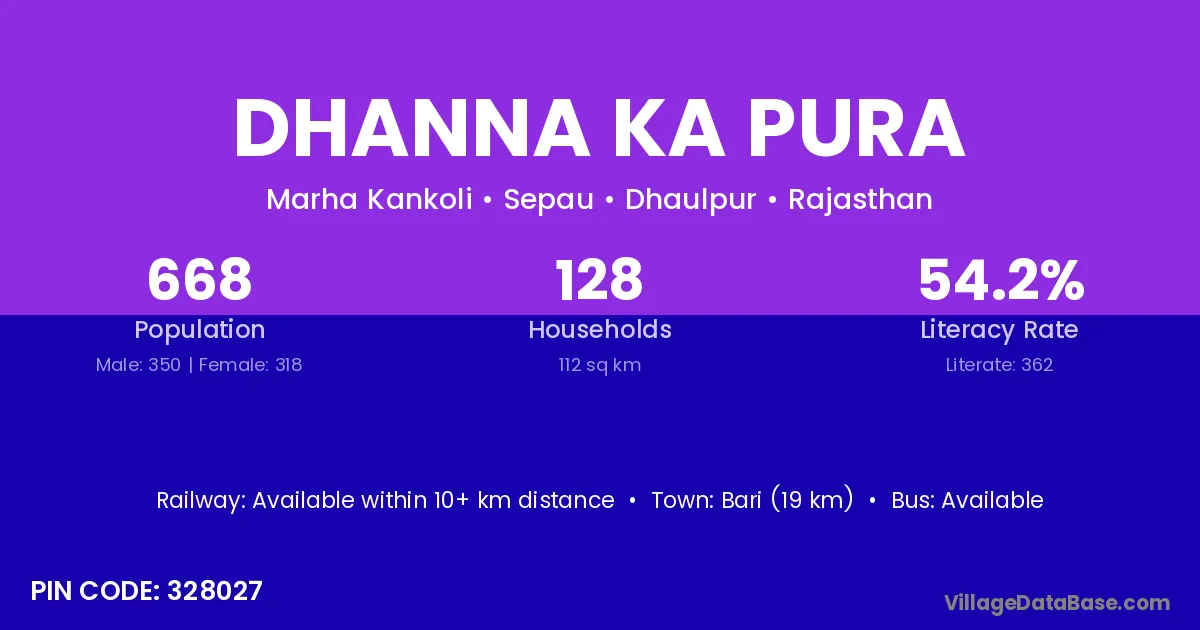 Dhanna Ka Pura village has a total population of 668 people, of which 350 are males and 318 are females.