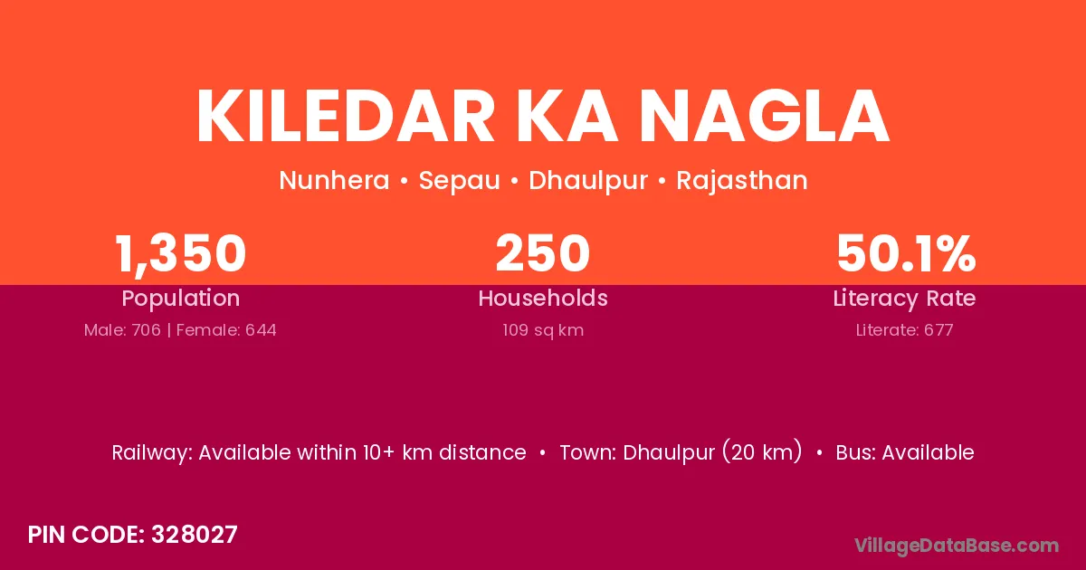 Dhaulpur (20 km) is the nearest town to Kiledar Ka Nagla village for major economic activities and is located approximately 20 km away.