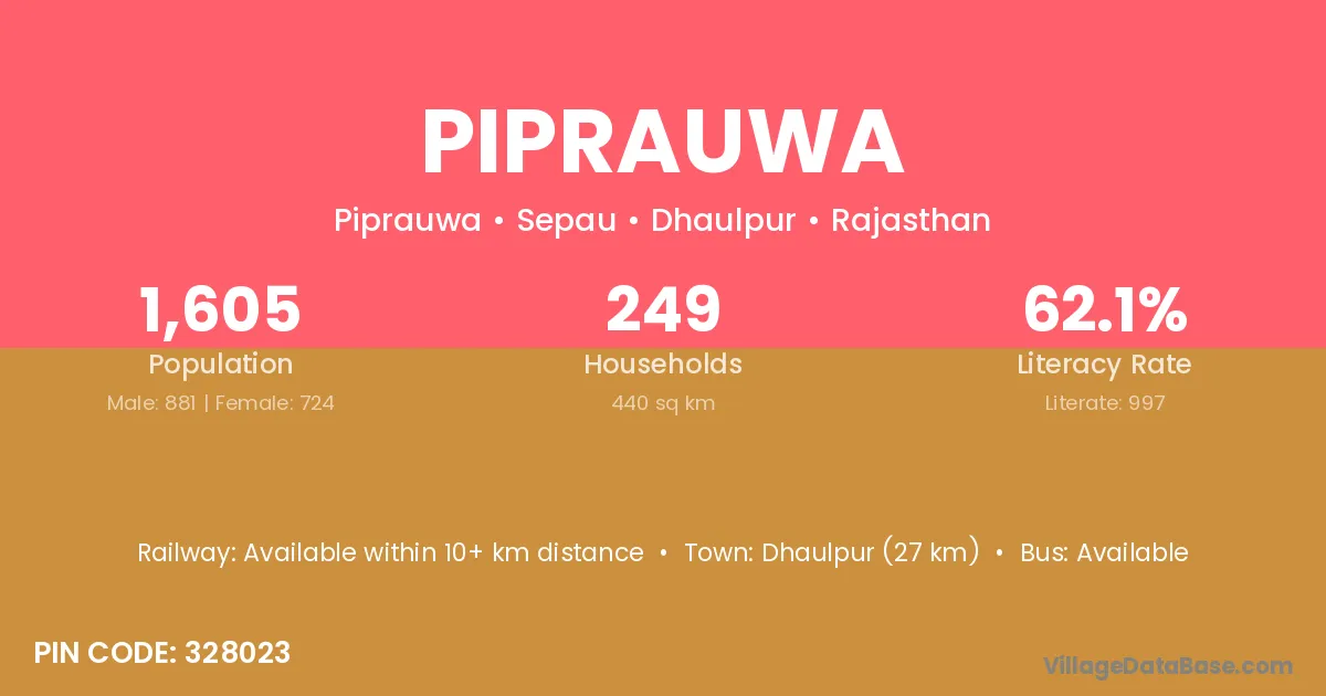 Dhaulpur (27 km) is the nearest town to Piprauwa village for major economic activities and is located approximately 27 km away.