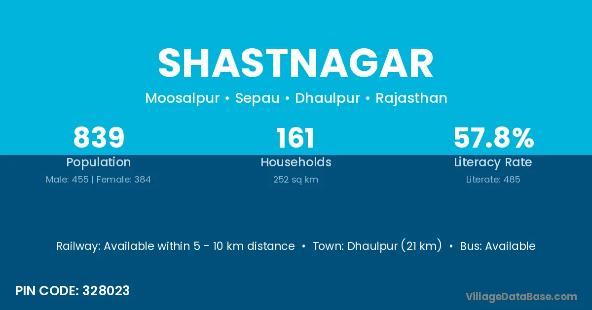 Dhaulpur (21 km) is the nearest town to Shastnagar village for major economic activities and is located approximately 21 km away.