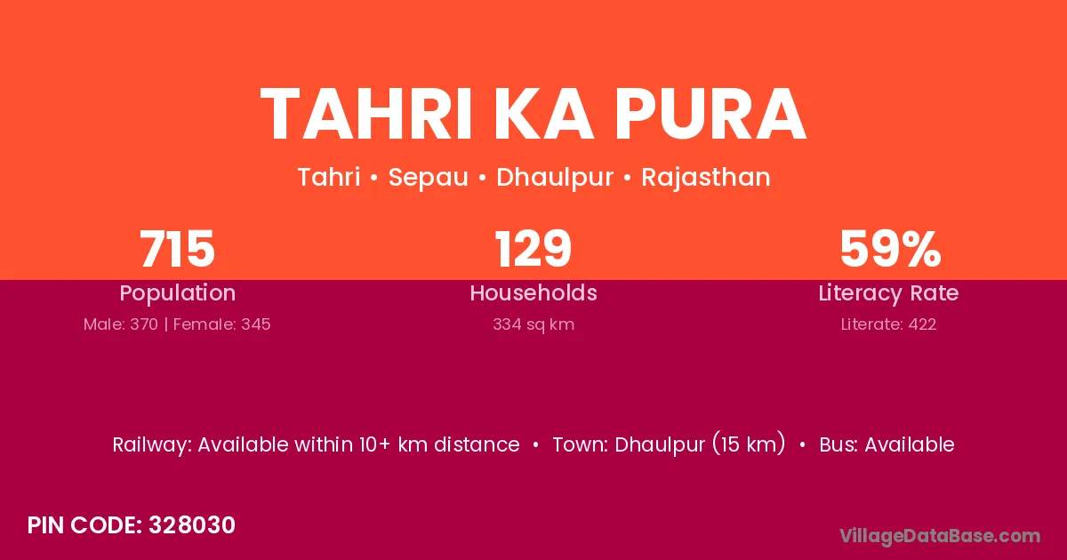 Dhaulpur (15 km) is the nearest town to Tahri Ka Pura village for major economic activities and is located approximately 15 km away.