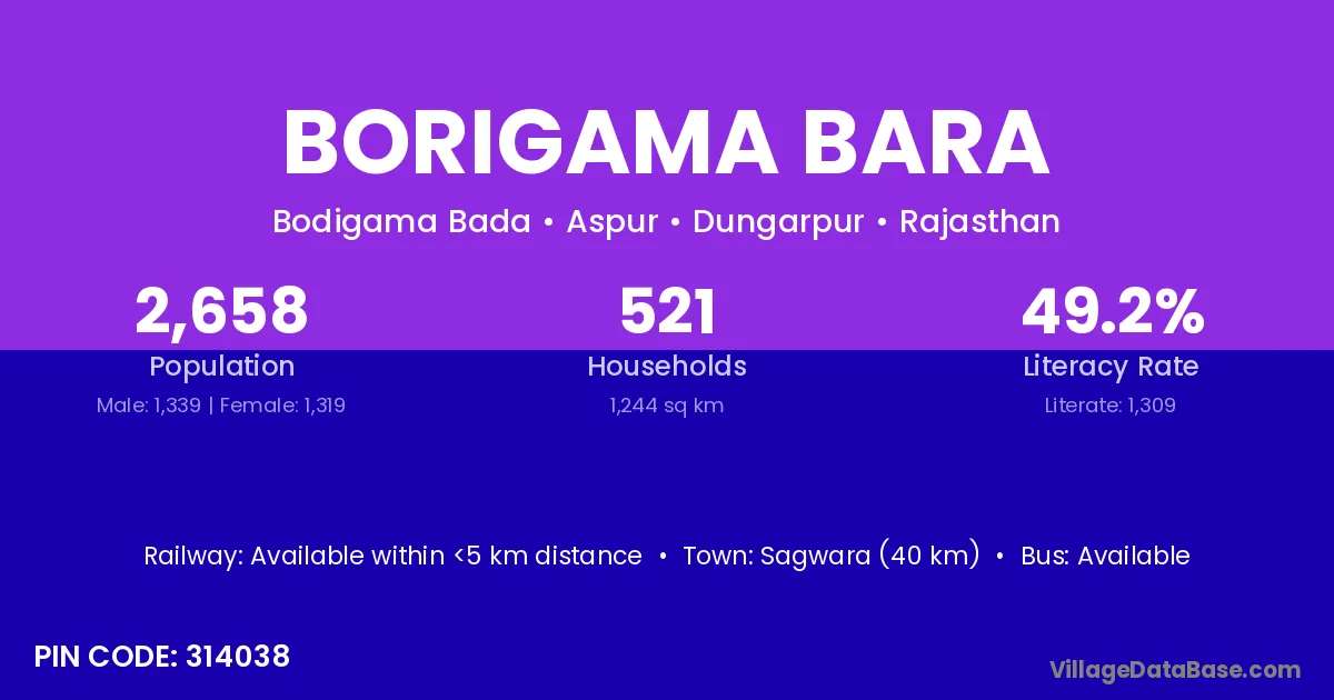 Sagwara (40 km) is the nearest town to Borigama Bara village for major economic activities and is located approximately 40 km away.