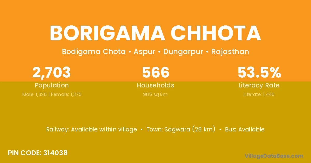 Sagwara (28 km) is the nearest town to Borigama Chhota village for major economic activities and is located approximately 28 km away.