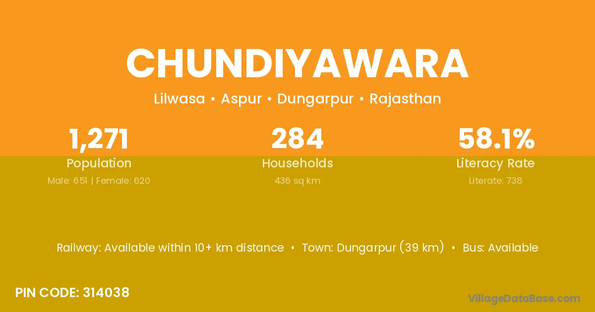 Dungarpur (39 km) is the nearest town to Chundiyawara village for major economic activities and is located approximately 39 km away.