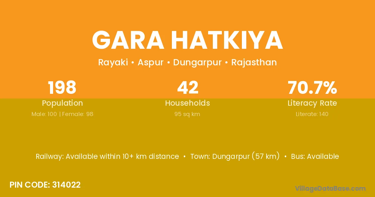 Dungarpur (57 km) is the nearest town to Gara Hatkiya village for major economic activities and is located approximately 57 km away.