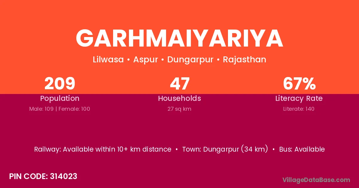 Dungarpur (34 km) is the nearest town to Garhmaiyariya village for major economic activities and is located approximately 34 km away.