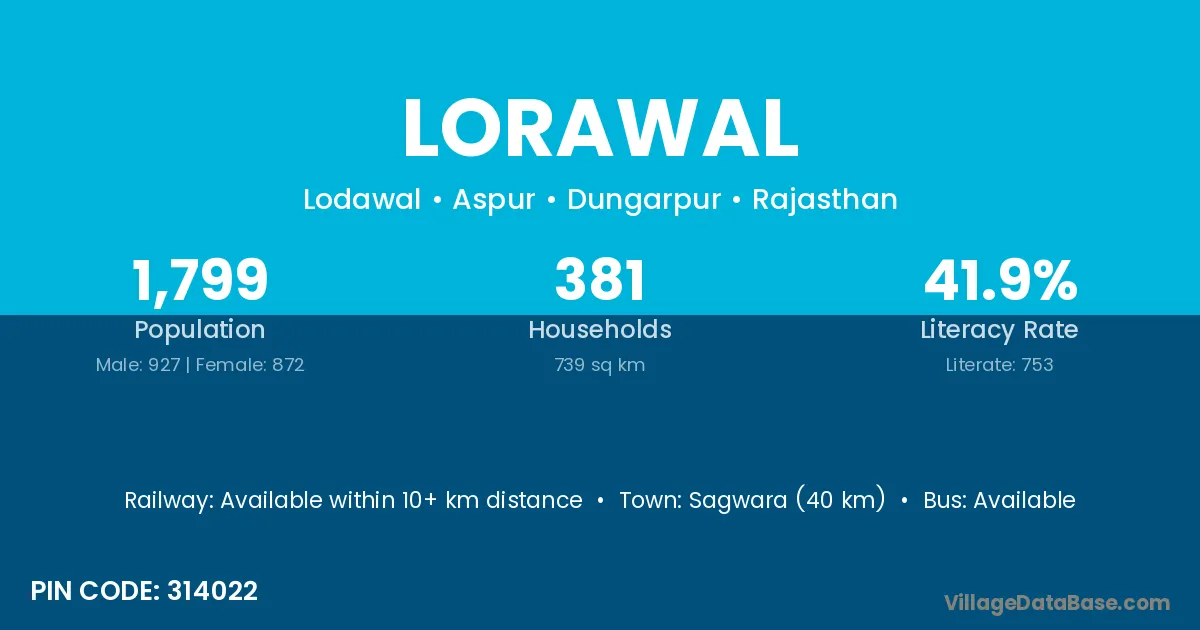 Sagwara (40 km) is the nearest town to Lorawal village for major economic activities and is located approximately 40 km away.