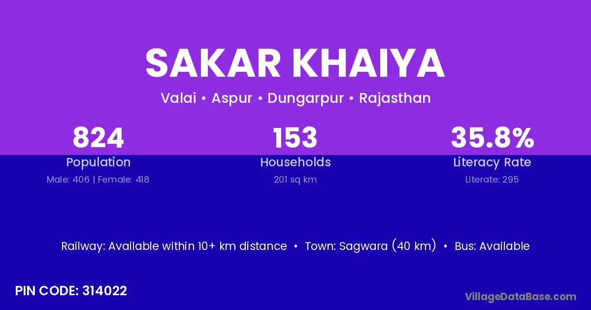 Sagwara (40 km) is the nearest town to Sakar Khaiya village for major economic activities and is located approximately 40 km away.
