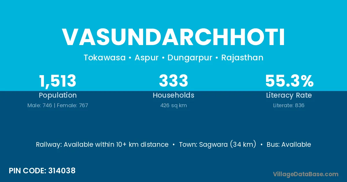 Sagwara (34 km) is the nearest town to Vasundarchhoti village for major economic activities and is located approximately 34 km away.