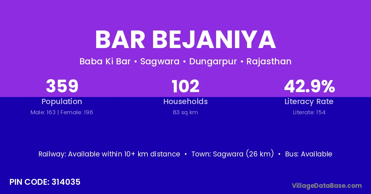 Sagwara (26 km) is the nearest town to Bar Bejaniya village for major economic activities and is located approximately 26 km away.