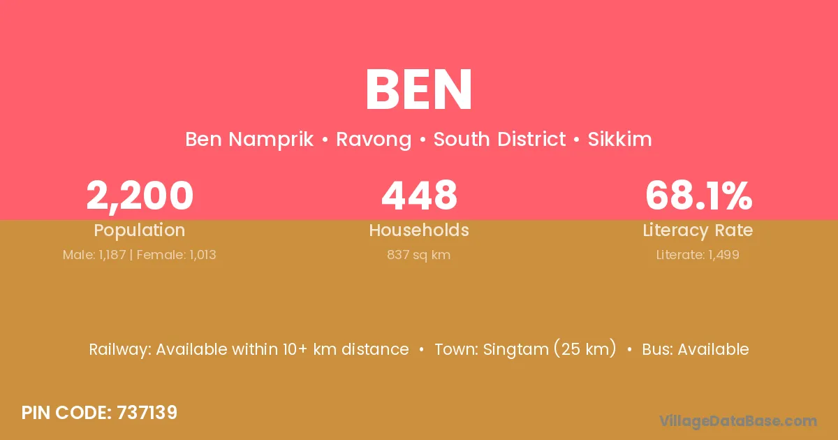 The literacy rate of Ben village is 39.14%. Male literacy stands at 48.91% and female literacy at 30.07%.